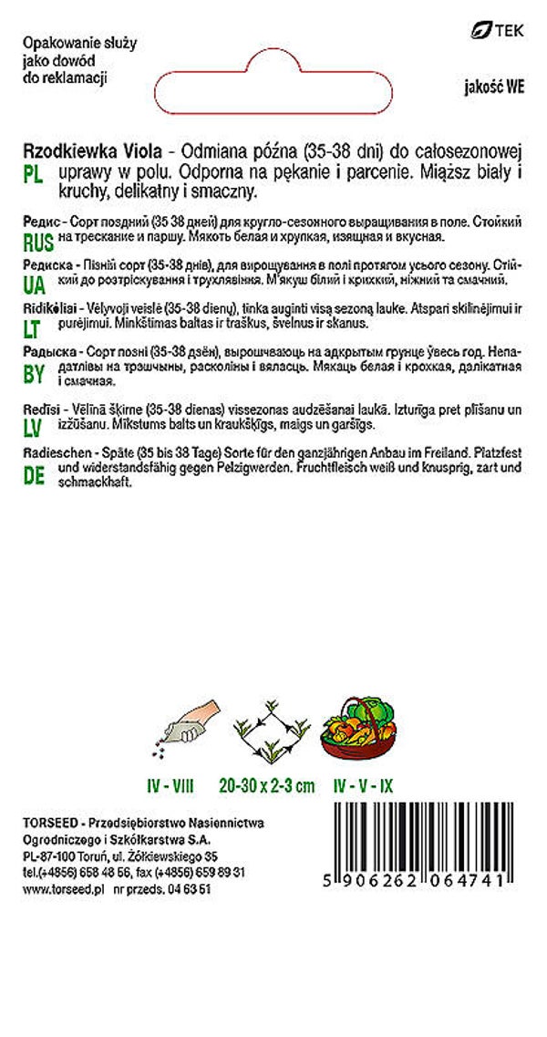(Raphanus sativus)Odmiana późna (35-38 dni) do całosezonowej uprawy w polu lub pod osłonami, charakteryzująca się żywym fioletowym kolorem. Miąższ delikatny, smaczny bez skłonności do parcenia, pękania. Rzodkiewkę należy siać na stanowiskach w pełni nasłonecznionych, na glebach żyznych.