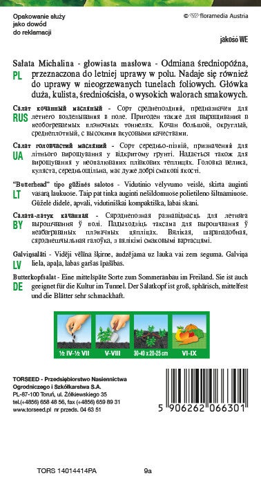 (Lactuca sativa)Sałata masłowa Michalina. Odmiana masłowa, średnio późna, polecana do letniej uprawy w polu. Główki średnio zwarte, dość duże, jasnozielone, o dużych walorach smakowych. Sałata chętnie kupowana ze względu na odpowiednią konsystencję liści.