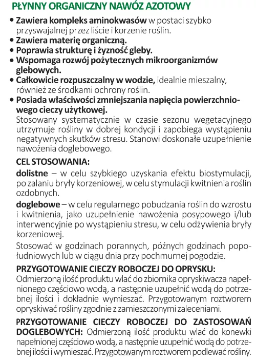 - Trawniki: 30-60 ml/100 m² – na start wegetacji i w razie potrzeby. Po aplikacji dokładnie podlej trawnik.